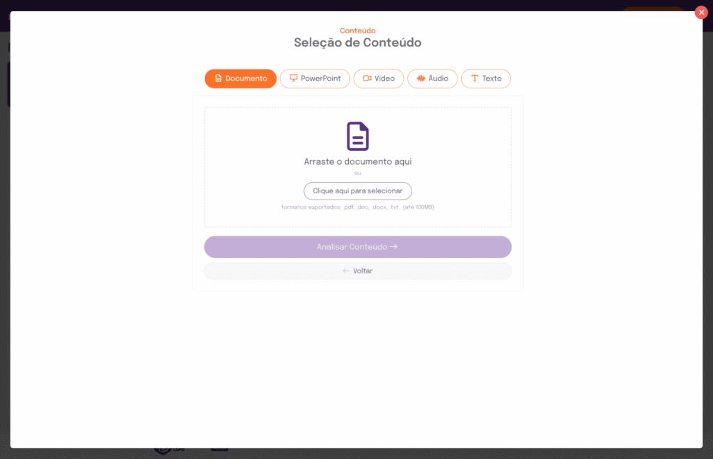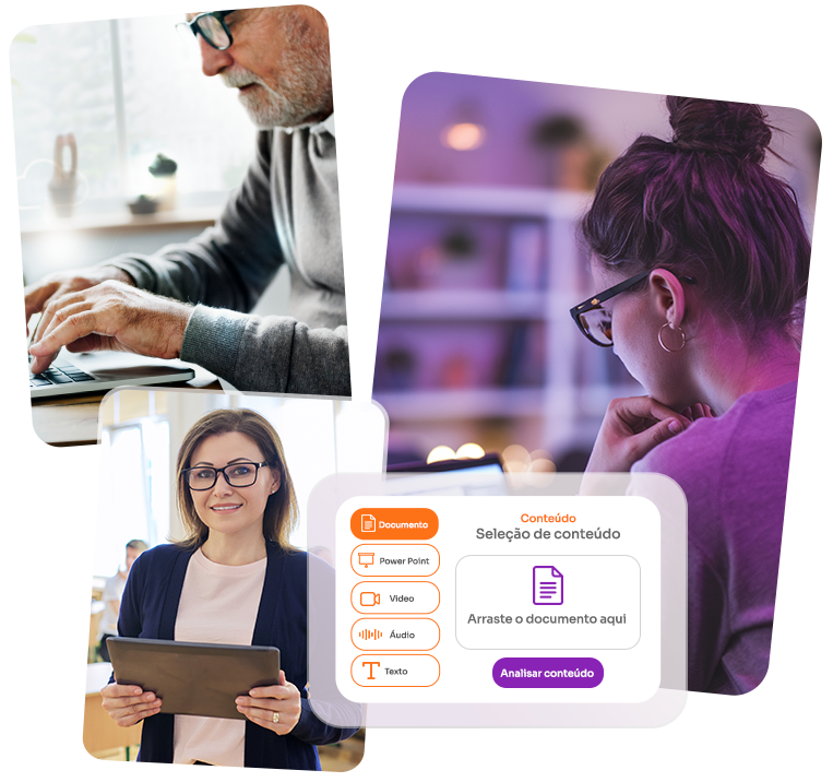 A nossa platatorma processa diversos formatos de objetos de aprendizagem e permite a flexibilidade na criação de questões. Exemplo de formatos: PPT, PDF, DOCX, MP3 e MP4.